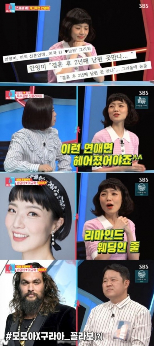 안영미는 지난 9일 방송된 SBS '동상이몽 2 - 너는 내 운명'에서 "게스트로 출연한 라디오 방송에서 제가 외롭다고 하니까 청취자였던 남편이 사연을 보냈다."라고 말했다.