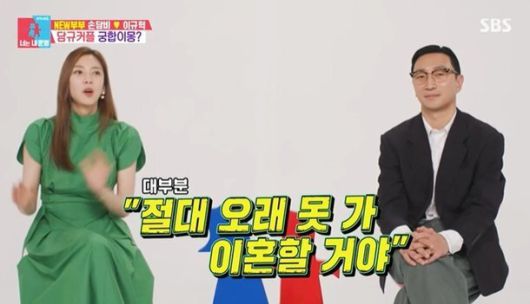 이날 손담비, 이규혁 부부는 “우리 새로 나온 거 있나 보자”며 ‘손담비 이규혁 궁합’으로 검색한 영상을 시청했다. 그러나 부부의 궁합 영상 썸네일에는 ‘결혼해도 오래 못 가’, ‘둘 다 이혼수가 있다’ 등 충격적인 말들이 적혀 있었다.