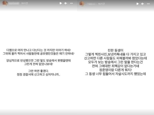 그러면서 "친한 동생 그렇게 찍힌 사진, 보낸 카톡 내용 다 가지고 있고 신고하면 다른 사람들도 피해볼까봐 참았다는데, 모두가 보는 방송에서 그런 말을 한다는 건 전혀 그에 대한 죄책감이 없다는 거네"라며 "정준영이랑 다른 게 뭐지? 그 동생 너무 힘들어서 극단 시도까지 했었는데"라고 B씨에게 몰카 피해를 입은 피해자가 심각한 고통 속에 극단적 선택까지 시도했었다는 충격적인 사건을 공개했다.