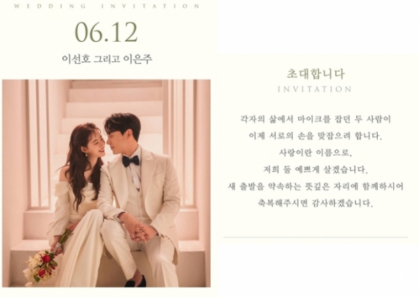 복수의 매체 보도에 따르면 두 사람의 청첩장에는 웨딩사진과 함께 "각자의 삶에서 마이크를 잡던 두 사람이 이제 서로의 손을 맞잡으려 합니다. 사랑이란 이름으로, 저희 둘 예쁘게 살겠습니다. 새 출발을 약속하는 뜻깊은 자리에 함께하시어 축복해주시면 감사하겠습니다."라는 문구가 담겼다.