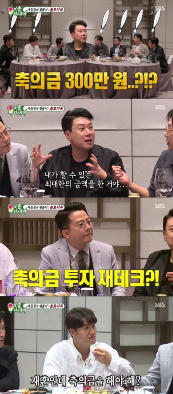 피로연에서는 축의금에 대한 이야기가 흘러나왔다. 이상민은 축의금으로 300만 원을 냈다고 해 모두를 놀라게 했다. 그는 “준우 신부에게 ‘이런 형이 있구나’ 하는 존재가 되고 싶었다”고 밝혔다. 그러나 탁재훈은 “네가 지금 어떤 상황인지 모르냐”고 해 웃음을 안겼다.