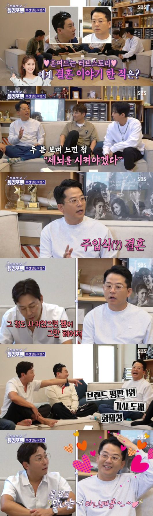 전진은 "그 사람이 하는 행동과 말투 이런 것들이 너무 좋아지면서 떨리더라"고 전했다. 탁재훈이 코웃음 치자, 전진은 "형은 옛날에 안 느꼈냐"고 물으며 본의 아닌 비수를 꽂았다. 이어 전진은 아내와 결혼했던 방법에 대해 "이서한테 '우리가 만나다 보면 결혼을 분명히 할 거고 넌 나랑 무조건 결혼식을 하고 예쁜 애기를 낳아서 살 거 같다. 무조건 내 말 들어'라고 했다"면서 "내 말 맞다고 계속 언급하고 얘기했다"고 결혼을 세뇌를 시켰다.