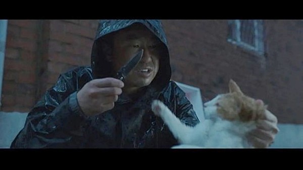 카라는 "사람을 살해한 전과가 있는 남성이 빗속에서 한 손에는 치즈 고양이의 목덜미를 움켜쥐고 한 손에는 칼을 들고 등장한다"며 "붙잡힌 고양이가 울부짖지만 학대범이 들고 있는 칼로 고양이를 위협하고 여러 차례 찔러 살해한다"고 이 장면을 설명했다.