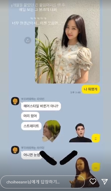 지난 18일 최희는 자신의 인스타그램을 통해 "5개월을 붙였던 긴 붙임 머리를 뗀 후 매일 보는 그 분과의 대화"라는 글과 함께 남편과의 대화 내용을 사진으로 첨부했다.