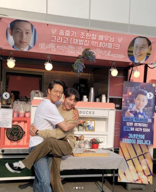 공개된 사진에는 앞서 송중기, 조한철이 출연했던 tvN 드라마 ‘빈센조’ 박재범 작가가 JTBC 새 드라마 ‘재벌집 막내 아들’ 촬영현장에 보낸 커피차 모습이 담겨 있다. 특히 사진 속에는 해당 커피차 앞에서 즐거워하고 있는 송중기, 조한철의 모습이 담겨 있어 눈길을 끌었다. 또 송중기는 조한철 품에 안긴 것도 모자라 거의 매달려 있어 웃음을 자아냈다.