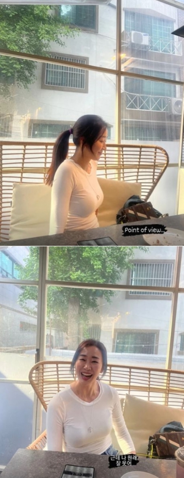 공개된 사진 속 김경화는 카페에 앉아 상체의 라인이 고스란히 보이는 티셔츠를 입고 여유로운 표정으로 포즈를 취하고 있다.