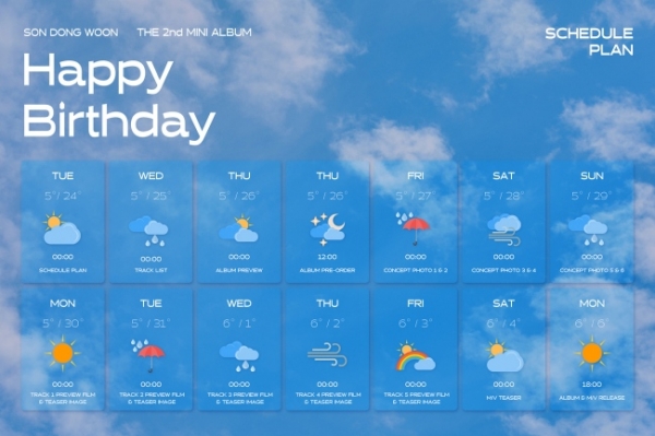 24일 0시 하이라이트 공식 SNS를 통해 손동운의 '해피 버스데이' 스케줄 플랜 이미지가 공개됐다. 날씨 예보에 빗대어 구성한 스케줄러에 따르면 손동운은 다음 달 6일 컴백 전까지 트랙리스트, 앨범 프리뷰, 6종 콘셉트 포토, 트랙별 프리뷰 필름 및 티저 이미지 5종, 뮤직비디오 티저까지 다채로운 콘텐츠를 선사할 예정이다.