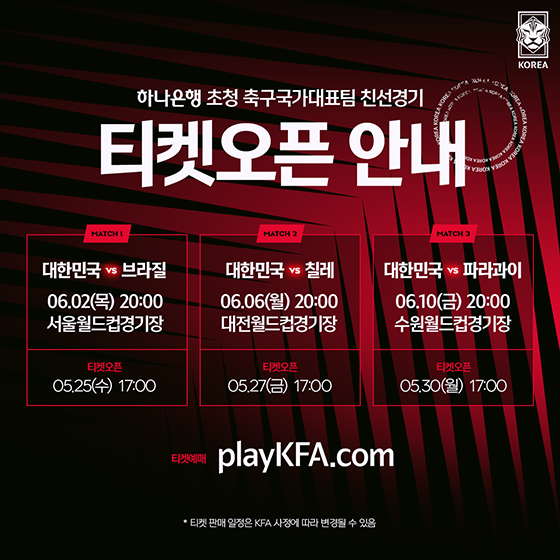 먼저, 6월 2일 서울월드컵경기장에서 열리는 브라질전은 25일 오후 5시부터 판매를 시작한다.