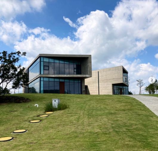 잔디 언덕 위에 자리한 카페는 길쭉한 나무 상자로 유리 상자를 감싼 듯한 모양의 건물로 'ㄱ'자 모양의 통창에 햇살이 들어와 개방감 높은 실내 공간을 연출했다.