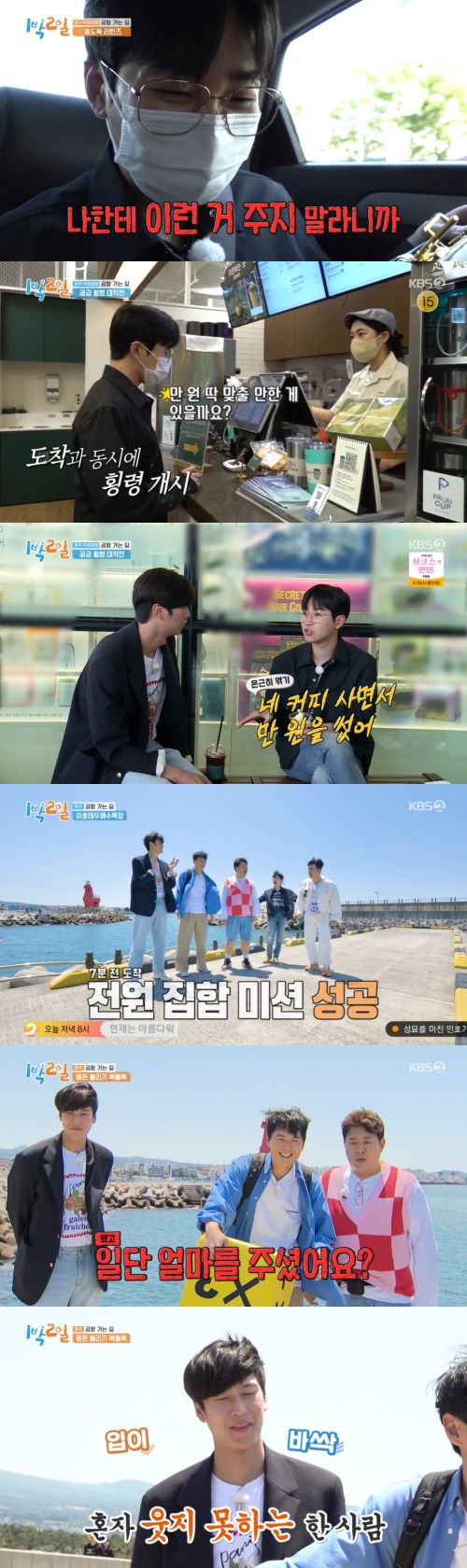 멤버들 중 가장 편하게 제주도로 가게 된 나인우는 "수학여행 이후로 제주도를 처음 가본다. 그게 벌써 10년 전이다"고 말했다. 딘딘과 김종민은 각각 대구와 포항으로 가기 위해 KTX를 탔다. 딘딘은 "피디님 바뀌고 오프닝이 제일 떨린다"고 말했다. 지난번엔 오프닝부터 울릉도 가는 복불복을 했기 때문이다. 딘딘과 김종민은 커피를 마시기 위해 미션을 만들어냈다. 딘딘과 김종민은 대합실에 있는 시민들이 다 들을 수 있도록 큰 목소리로 말했다. 덕분에 첫 시도에 성공했다. 그런데 딘딘이 말을 걸었을 때는 무덤덤하던 시민이 김종민이 다가오자 깜짝 놀라며 벌떡 일어났다. 시민은 딘딘을 그냥 대학생인 줄 알았다고 했다.