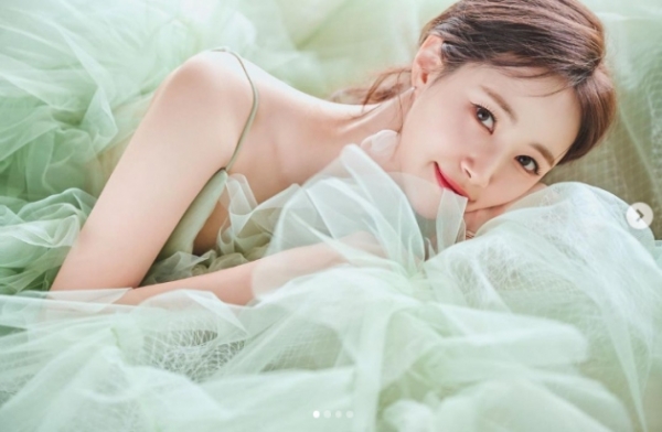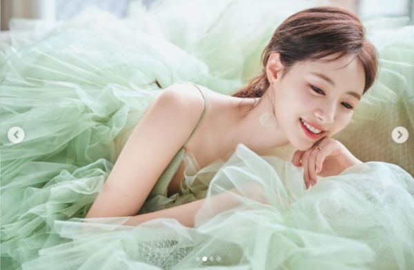 사진 속에서 이은주 아나운서는 옅은 녹색 계열의 화사한 드레스를 입고 포즈를 취했다. 우아한 웨딩 화보 속 이 아나운서의 미모가 돋보인다.