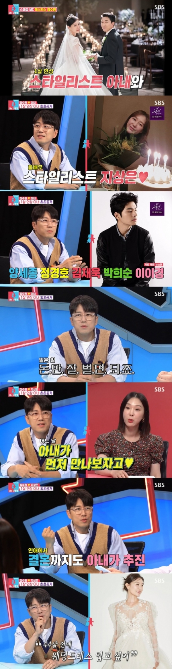 결혼 8개월차에 접어들었다는 장수원은 1살 연상 스타일리스트와 결혼했다며 "스타일리스트 지상은이라고 한다"라고 아내의 이름을 언급해 이목을 끌었다. 이지혜는 실명 공개까지 하냐며 놀라워했다.