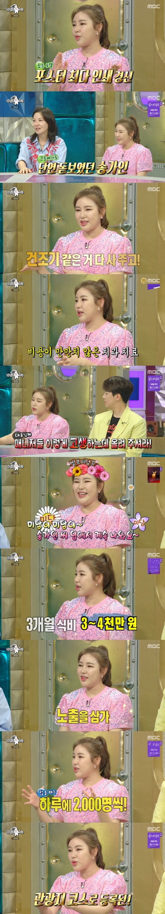 송가인은 콘서트 준비와 새 앨범 활동으로 바쁜 근황을 전하며 시선을 모았다. '매출 상승 보증 수표'가 된 송가인은 상승효과를 크게 누린 광고 물품으로 전라도 지역 소주를 꼽았다. 송가인이 모델이 된 이후, 포스터 최다 인쇄를 경신했다고. 이어 송가인은 세계적인 배우 안젤리나 졸리에 이어 국내 스타 최초로 고가의 주얼리 브랜드에서 억 단위 다이아몬드 목걸이를 협찬 받아 웨딩 화보를 촬영했다고 밝히며 모두를 놀라게 했다.