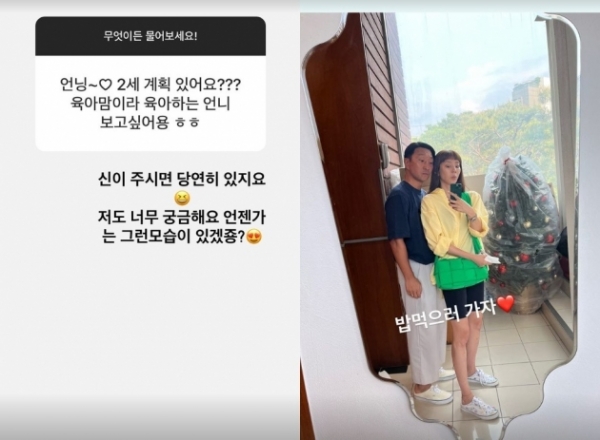 팬들은 손담비에게 많은 질문을 던졌다. 그 중에서 한 팬은 "언니, 2세 계획 있어요? '육아맘'이라 육아하는 언니 보고싶어요"라고 질문했다.