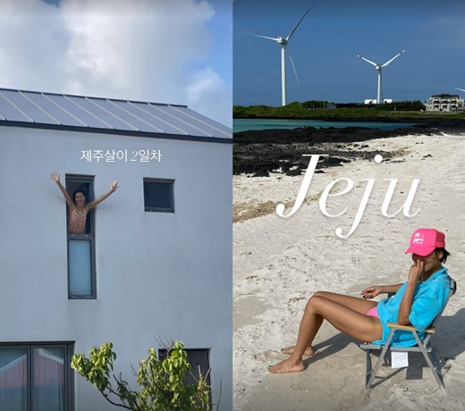 김나영은 제주살이 2일차라고 밝히며 창문에서 환한 미소로 만세를 하고 있다. 또 다른 사진에서 김나영은 해변에 앉아 수영복을 입고 제주의 햇빛은 쬐고 있다.