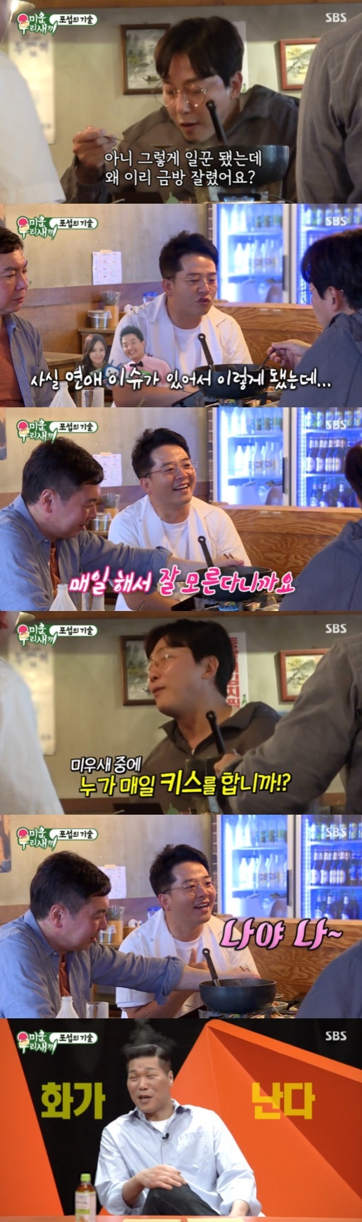 이에 탁재훈은 "키스 언제 마지막으로 했냐"라 짓궂게 물었고, 김준호는 "매일 해서 잘 모른다"라며 수줍게 웃었다. 탁재훈은 "미우새 중에 누가 매일 키스를 하냐"라며 분노해 웃음을 자아냈다.