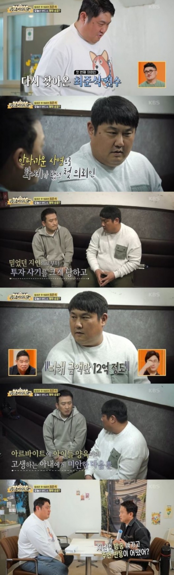 지난 12일 방송된 KBS 2TV '자본주의학교'에서는 야구 선수 출신 방송인 최준석이 서경석을 찾아 다시 한번 의뢰를 하는 모습이 그려졌다.