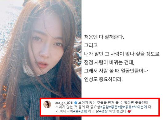 이와 함께 고아라는 "보이지 않는 것들을 먼저 볼 수 있다면 좋을텐데 .보이지 않는 것들의 더 중요함. 보이는게 다가 아니니까 잘 경험하고 잘 성장하면 좋겠다"라는 글을 덧붙였다. 그는 '#공감' '#좋은글' '#공유' 등의 해시태그를 덧붙이기도 했다.