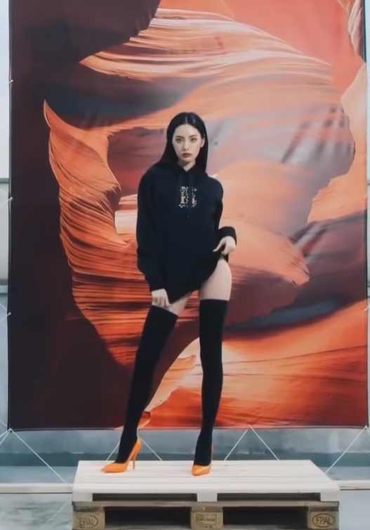 보디수트에 후드티, 하이 레그 삭스와 오렌지색 킬힐을 매치하며 유니크한 패션을 연출하고 있다.