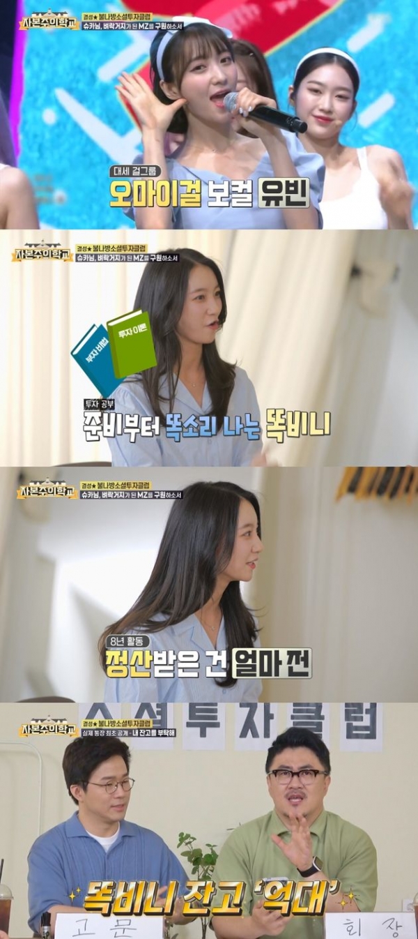 오마이걸 유빈은 12살에 아역배우부터 경제 활동을 시작했다. 유빈은 “팀 활동을 하며 정산 받은 건 얼마 전이다. 지금은 번 돈을 저축하고 있다. 투자는 불안해 하는 게 많아서 제대로 준비하고 하려고 한다”며 아직은 주식이나 코인에 투자한 경험이 없다고 밝혔다.