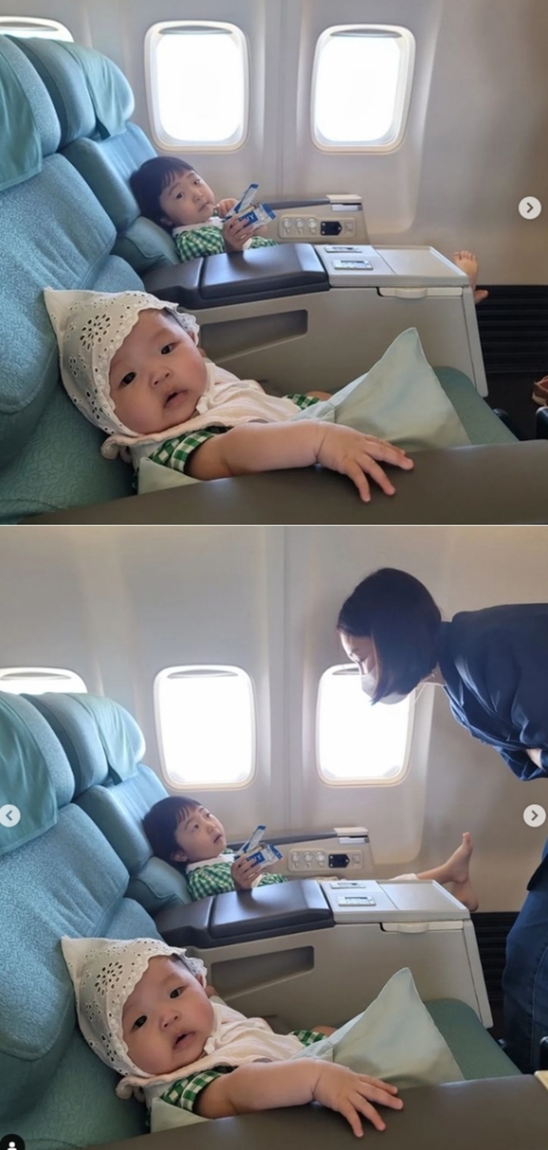 공개된 사진 속 아내 이지혜는 비행기 비즈니스석에 한 명씩 앉아 있는 딸 태리 양과 엘리 양을 케어하고 있는 모습이다.