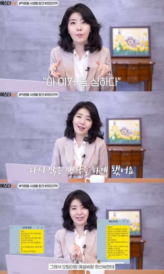 이어 "인터뷰에서 저를 보고 시어머니 같은 보스라고 할 때 완전 뜨끔했다. 세상에 많은 시어머니들이 며느리를 보고 '너는 내 딸이야'라고 하는데 며느리들은 딸로 생각을 안 한다. 저도 아들 둘 키우면서 며느리한테 안 그래야지 했는데 방송을 보니 내가 그 행동을 하고 있더라. 직원들에게 미안하다고 했다."라고 덧붙였다.