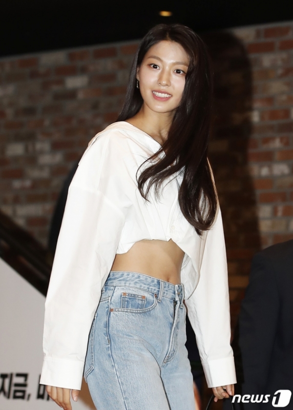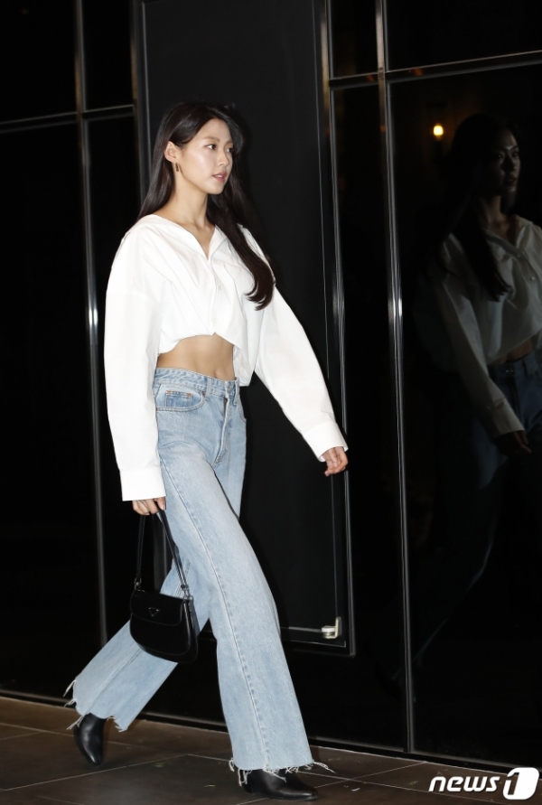 이날 설현은 복근을 강조한 흰색 상의에 청바지를 입고 나타났다. 조막만 한 얼굴에 시원하게 뻗은 긴 팔다리가 예쁜 미소와 더해져 시선을 사로잡았다.