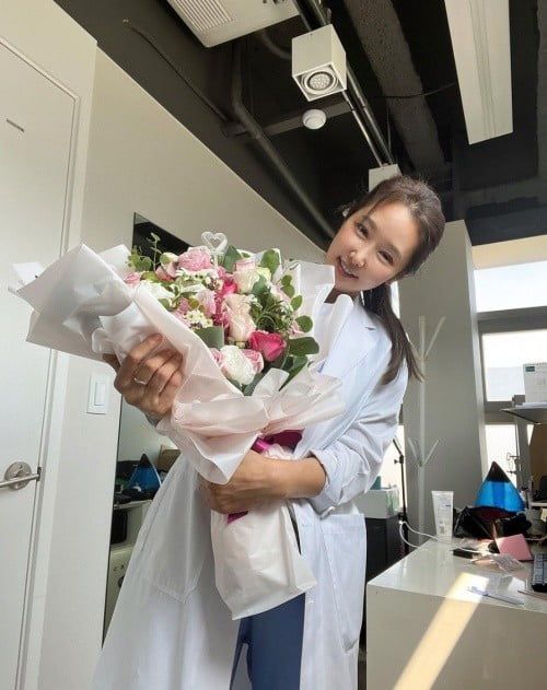 사진에는 의사 가운을 입은 이수진이 큰 꽃다발을 들고 밝게 웃고 있다. 이수진의 지인은 "사랑하는 내 친구 수진아, 꽃길만 걷자"며 "너무나 축하한다"고 카드를 보냈다.