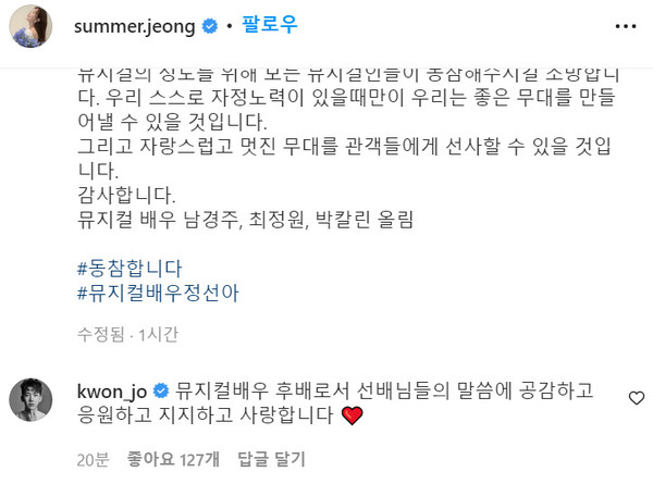 22일 정선아는 자신의 인스타그램에 사진 한 장과 함께 원로 뮤지컬 종사자 남경주, 최정원, 박칼린 등의 공식 입장문을 공유했다.