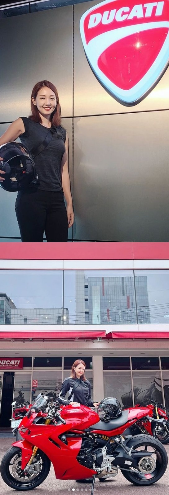사진 속 오정연은 빨간색 두카티 바이크를 옆에 두고 포즈를 취했다.