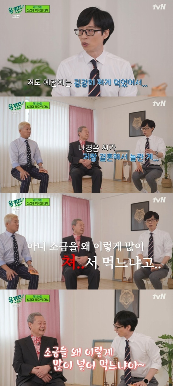 이날 유재석은 '싱겁게 먹기 실천연구회'의 설립자인 김성권 교수의 출연에 짜게 먹었던 과거의 식습관을 고백했다. 유재석은 "저도 예전에 굉장히 짜게 먹었다, 나경은 씨가 저랑 결혼해서 놀란 게 설렁탕 같은데 소금을 굉장히 많이 넣어 먹어서"라고 부연했다.