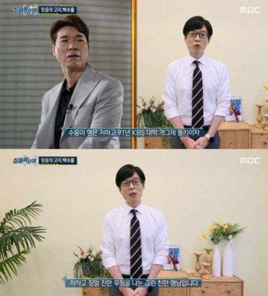 유재석은 박수홍에 대해 “진짜 좋은 형...형을 좋아하고 존경한다”고 말했다. 그는 “1991년 KBS 대학 개그제 동기이자 정말 진한 우정을 나눈 친한 형”이라며 “지금도 그 착한 심성과 성품은 변하지 않았고 제가 힘들 때 형이 저를 참 많이 위로해줬다”고 말했다.