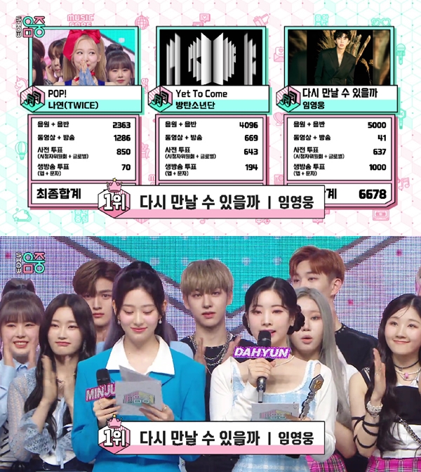 지난 2일 방송된 MBC '쇼! 음악중심'에서는 트와이스 나연의 'POP!', 방탄소년단의 'Yet To Come', 임영웅의 '다시 만날 수 있을까'가 1위 후보에 오른 가운데 최종 1위는 임영웅이 차지했다.