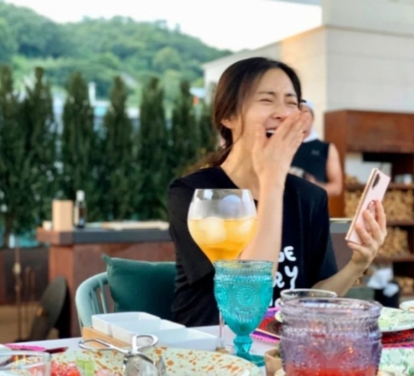 공개된 사진에는 송윤아가 한 식사 자리에서 환하게 웃고 있는 모습이 담겼다. 손으로 입을 살짝 가린 송윤아는 청순한 미모와 함께 행복한 표정을 짓고 있어 눈길을 끈다.