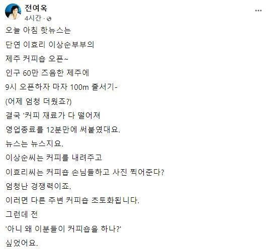 전 전 의원은 3일 페이스북에 “오늘 아침 핫뉴스는 단연 이효리 이상순 부부의 제주 커피숍 오픈. 인구 60만 즈음한 제주에 9시 오픈하자 마자 100m 줄서기(어제 엄청 더웠죠?) 결국 '커피 재료가 다 떨어져 영업종료를 12분만에 써붙였다. 뉴스는 뉴스다”라며 이효리 이상순 부부의 카페 오픈에 대해 언급했다.