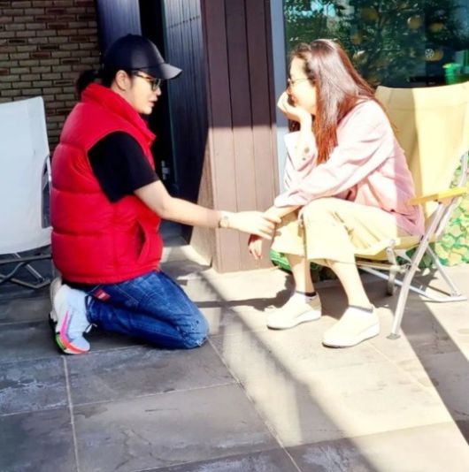 공개된 사진 속 송윤아는 김혜수와 함께 시간을 보내고 있다. 김혜수는 간의 의자에 앉은 송윤아를 마주보고 있다. 특히 김혜수는 송윤아에게 무릎을 꿇고 앉은 자세를 하고 있어 눈길을 모은다.