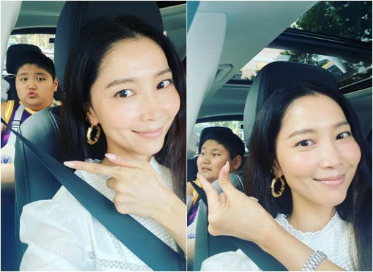 3일 오윤아는 자신의 인스타그램에 하트 이모티콘과 사진을 게재했다. 민이와 차에 앉아 찍은 셀피다.