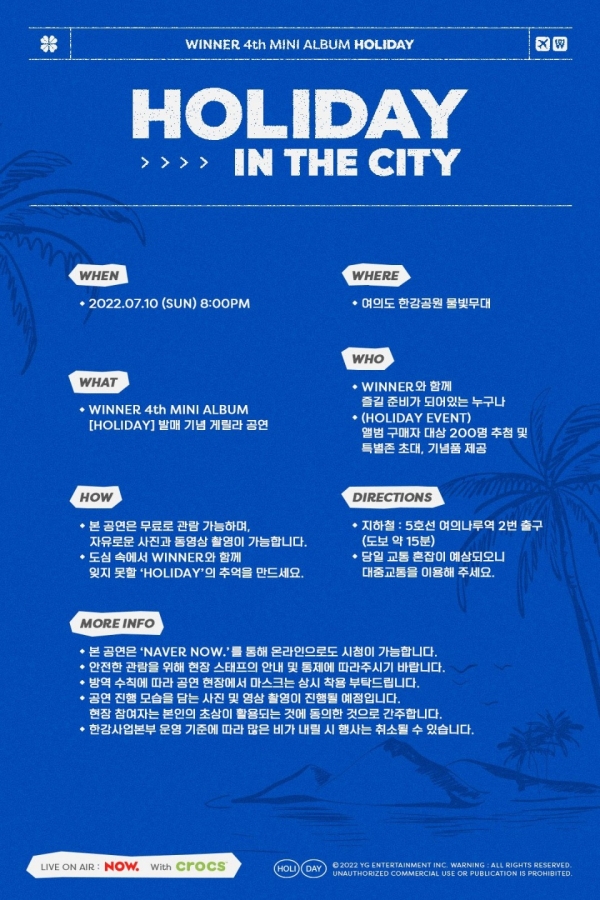 YG 엔터테인먼트는 SNS를 통해 위너의 게릴라 콘서트 소식을 전했다. 도심 속에서 위너와 함께 잊지 못할 ‘HOLIDAY’의 추억을 만들 수 있는 게릴라 콘서트의 날짜와 시간은 오는 7월 10일 오후 8시이며, 장소는 여의도 한강공원 물빛무대이다. 누구나 무료로 관람할 수 있으며 앨범 구매자를 대상으로는 추첨을 진행해 특별존 초대와 기념품을 제공한다.