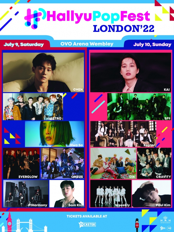 이번 '한류 팝 페스트 런던 2022'에는 다양한 아티스트들이 함께한다. 9일에는 첸, 아스트로, 화사, 에버글로우, 원어스, 피원하모니, 샘킴. 10일에는 카이, SF9, 케플러, CIX, 크래비티, 위클리, 폴킴이 출연한다.