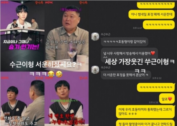 이에 이승기는 "수근이형 서운하셨쎄요?ㅋㅋㅋ"라고 반응을 했다. 그러면서 이수근과 주고 받은 카톡 내용 일부를 캡처해 공개했다. 공개된 카톡 내용에 따르면 이승기는 "아니 썸네일 표정 왜케 서운한데ㅋㅋㅋㅋ"라고 웃었고 이수근은 "호동 형이랑 같이 있어. 널 너무 사랑해서 방송에서 이용했어^^"라고 해명했다. 그러면서도 "더 서운한 표정을 못해서 혼났어ㅋ라고 하기도.