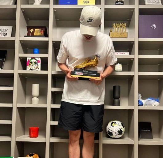 공개된 사진 속 공유는 손흥민이 받은 2021/2022 시즌 EPL 득점왕상인 골든부츠 트로피를 들고 인증샷을 남기고 있다.