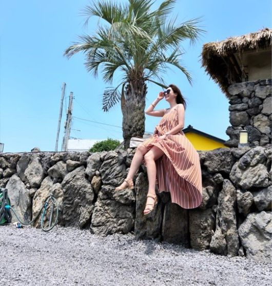 공개된 사진 속 이혜원과 안정환은 제주도 여행을 떠난 모습. 이혜원은 제주 돌담 위에 앉아 미스코리아 출신답게 자연스러운 포즈를 취하고 있다.