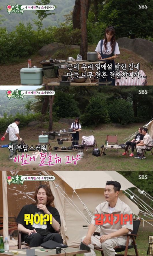 10일 방송한 SBS TV 예능물 '미운 우리 새끼'(미우새)에서는 두 사람이 캠핑 데이트를 즐기는 모습이 그려졌다. 김지민은 "우린 열애설을 밝힌 건데 다들 결혼, 결혼하니까 (부담된다)"고 토로했다. 김준호는 "뭔 부담이야. 이참에 결혼해 그냥"이라고 했다. 그룹 '코요태' 김종민은 "프러포즈예요?"라며 놀랐고, 김지민은 "프러포즈가 멋이 없다. 화로 들고 오면서 '이참에 결혼해'(라고 한다)"며 웃었다.