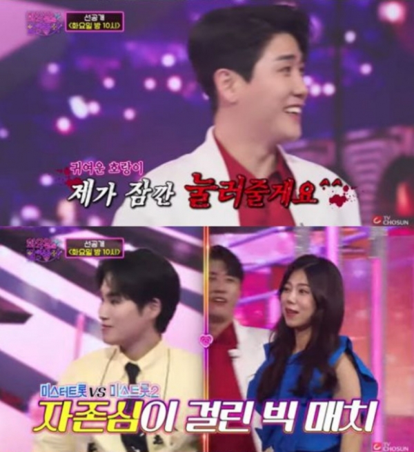 이날 영탁과 김희재는 등장부터 뜨거운 신경전을 벌였다. 영탁은 여유로운 표정을 지으며 큰 기합 소리를 내 눈길을 끌었다.