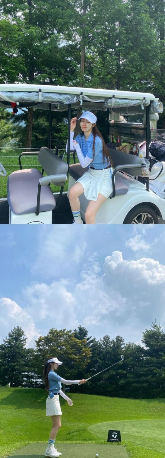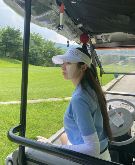공개된 사진에는 골프 카트에 앉아 청량한 하늘색 골프웨어를 입고 눈 감고 있는 지연의 모습이 담겨있다. 두 볼에는 골프장의 뜨거운 햇빛에 피부가 타지 않도록 도와주는 자외선 차단 패치를 붙이고 있다. 얼굴을 거의 다 가린 듯한 자외선 차단 패치는 지연의 작은 얼굴 크기를 실감케 한다.