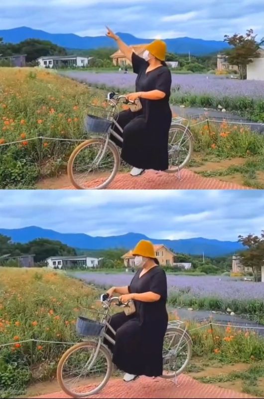 영상 속 하재숙은 자전거에 타고 하늘을 가리키고 있다.