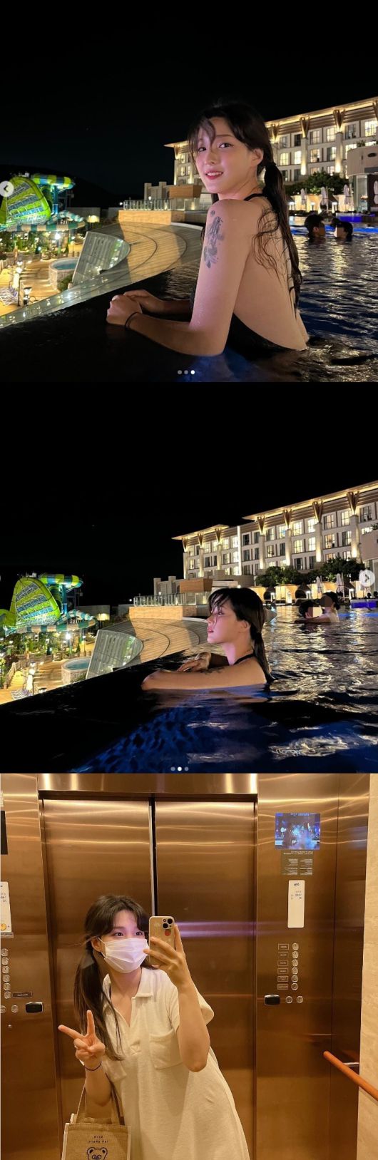 함께 공개된 사진에는 여행지의 호텔 수영장에서 포즈를 취하고 있는 율희의 모습이 담겨있다. 팔에 새겨진 강렬한 타투가 시선을 끈다.