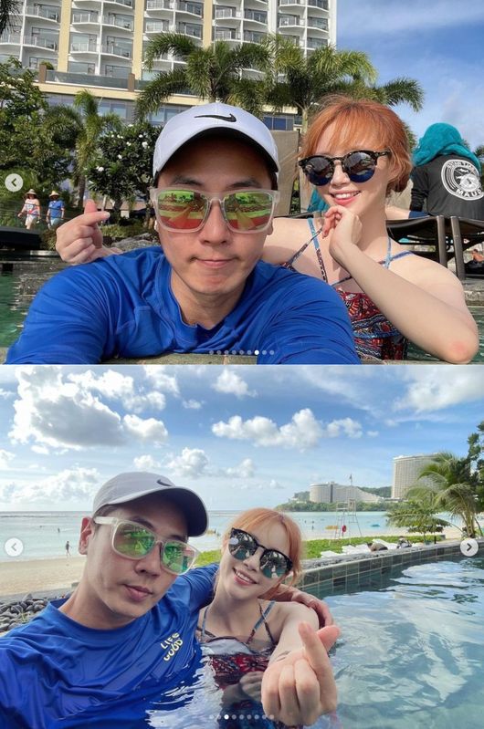 공개된 사진 속에는 앤디, 이은주 부부가 호텔 수영장에서 물놀이를 즐기는 모습이 담겨있다. 두 사람의 뒤에는 에메랄드빛 바다와 야자수 풍경이 펼쳐져 감탄을 자아낸다.