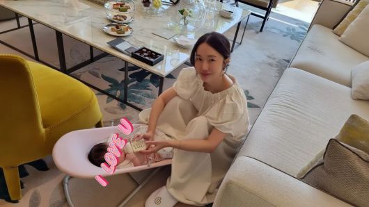 공개된 사진에는 이정현이 인천 한 호텔의 넓은 룸에서 아기와 함께 있는 모습이 담겼다. 이정현은 아기에서 젖병을 물린 채 카메라를 향해 미소를 지은 모습으로, 출산 3개월 만에 늘씬해진 얼굴 턱선이 눈길을 끈다.