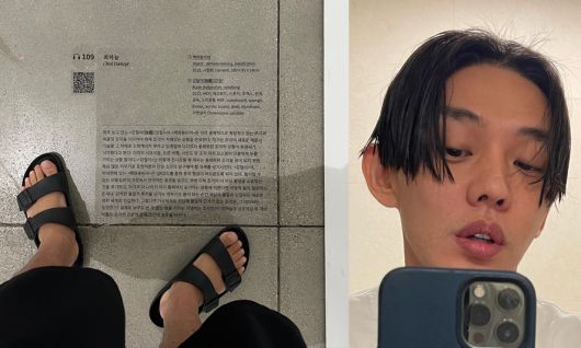 함께 공개한 사진에는 최하늘 작가의 작품 설명이 담긴 안내문과 그 앞에 서 있는 자신의 발이 담겼다. 최하늘 작가와 친분이 있는 만큼 가벼운 마음으로 농담을 건넨 것으로 보인다.